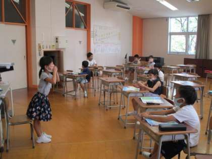 「やまびこごっこ」の学習をしました。友達の言葉や声のトーンをそっくり真似て、楽しそうな子供たちでした。