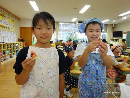 畑で収穫したスイカやカボチャを切ってみました。外側とは違った中身に、子どもたちは驚いていました!小さなスイカでしたが、カラスから守り、皆で大切に育てた分、おいしく食べることができました!