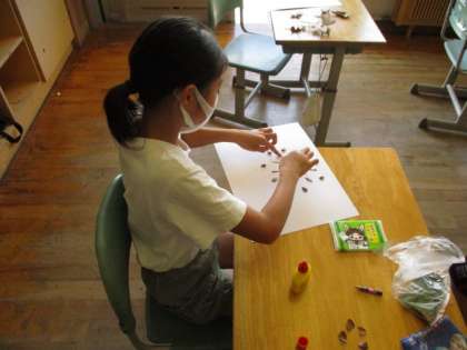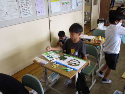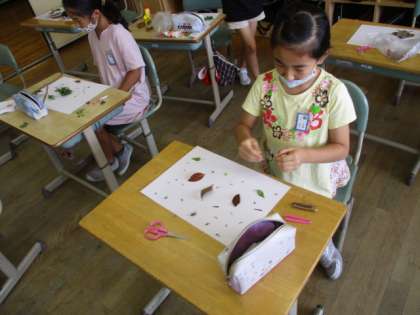 図工では、葉を使って水彩画を描きました。葉を組み合わせることでいろいろな形を作り、楽しい絵ができあがっています。