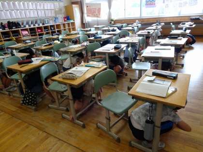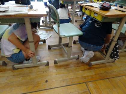 今日は地震を想定した避難訓練がありました。 放送後、すぐに身を守る行動ができていました。