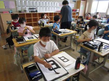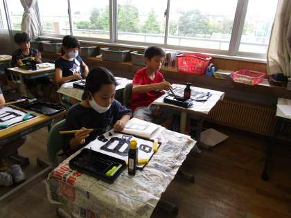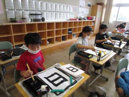 書写では「日」を書きました。縦画や横画だけでなく、折れの部分に気を付けて真剣に練習しました。
