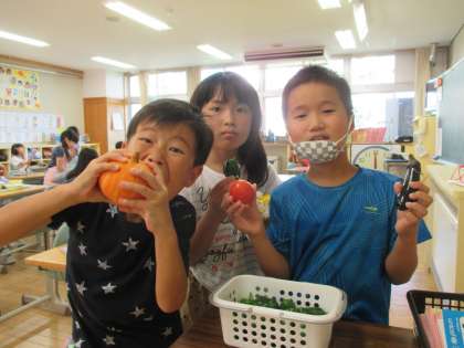 今日は、野菜がたくさん採れました!トマト、ナス、ピーマン、カボチャ、色とりどりの夏野菜です。