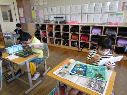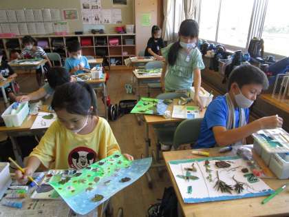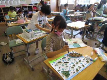 図工では、葉を使って色とりどりの作品を作りました。工夫を凝らし、見て楽しい絵ができました。