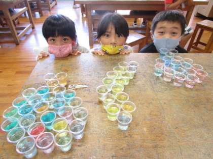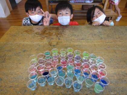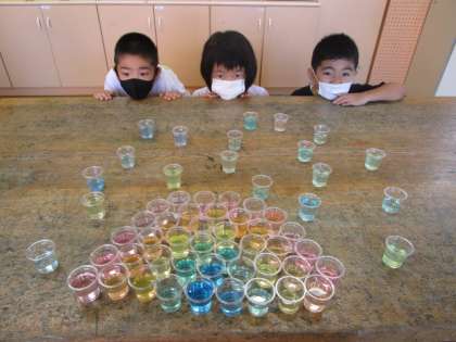 1年生 「カラフル色水」松組 その2 公開日 2020/09/04 更新日 2020/09/04 1年生 最初は1人で形をつくっていた子供たちでしたが、だんだん物足りなくなり、友達と協力して大きな形をつくって楽しむ姿も見られました。