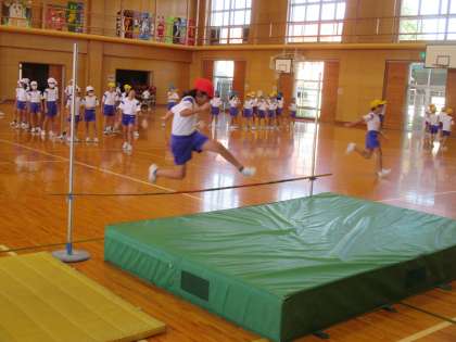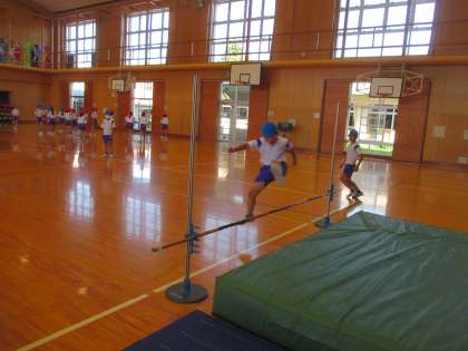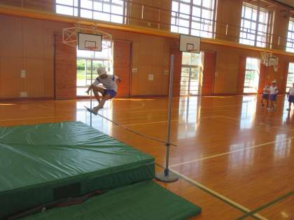 次は実際にバーを飛び越えます。 走り方や足の上げ方を意識して練習しました。
