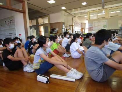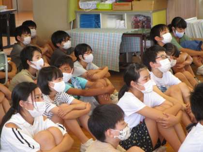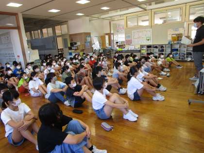 運動会の係についての話を聞く、真剣な表情の子供たち。