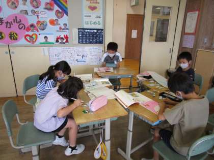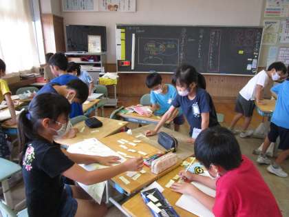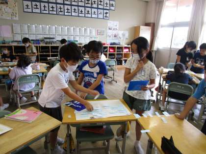 3年生 山小屋で3日間すごすなら 公開日 2020/09/10 更新日 2020/09/10 3年生 国語科で「山小屋で3日間すごすなら」という学習を行っています。 今日は、グループのメンバーと対話しながら、何を持って行くか、何をしたいかを出し合いました。 「川遊びをしたい。水着と釣り竿を持って行こう!」 「山で洞窟探検が楽しそう。懐中電灯があったらいいんじゃない?」