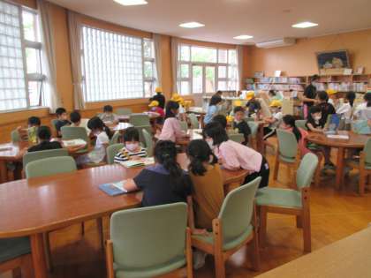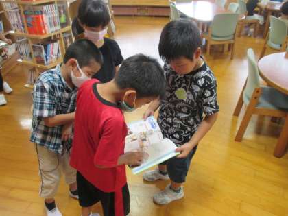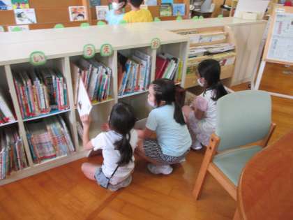 図書室へ本を借りにいきました。「どの本がおもしろそうかな?」と本とにらめっこしたり、「あっ、これ、生活のおもちゃ作りに使えそう!」と友達同士で、紹介したりしていました。