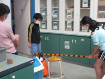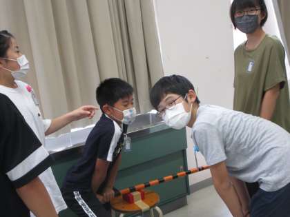 6年生 てこのはたらき2 公開日 2020/09/16 更新日 2020/09/16 6年生 学校のてこは、しましま模様です。 ある班では、このしま模様を目盛りに見立てて、実験していました。 「この目盛りからは、1人の力では持ち上げられないよ」 友達と相談しながら、実験をつくっていました。