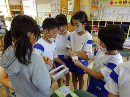 2年生 休み時間・給食準備 公開日 2020/09/16 更新日 2020/09/16 2年生 休み時間には、係の集会をしたり、体育館で遊んだりして、元気いっぱいの2年生です!また、素早くエプロン姿に着替え、ワゴンの運搬を手伝う姿が見られました!