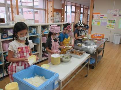 給食の時間!給食当番も慣れてきて、手際よく上手に配膳していました。