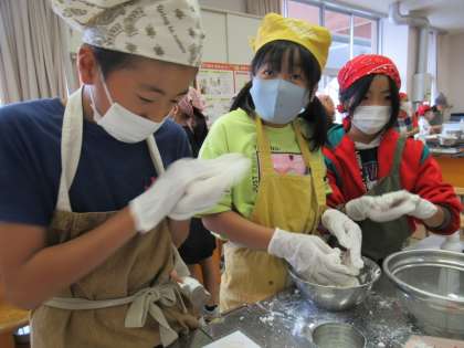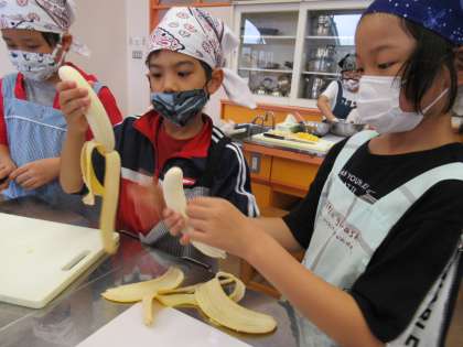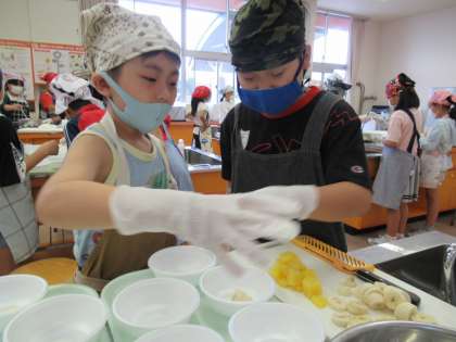 まずはフルーツ白玉チーム。白玉をゆでたりフルーツを切ったりと、手際よく進めました。