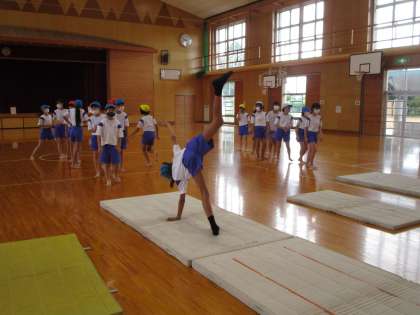 5年生 マット運動 公開日 2020/09/28 更新日 2020/09/28 5年生 体育では、「つなごうマットの技」の学習をしています。前転と後転に加え、各自が選んだ技をつなげて練習を行っています。側転やロンダートなどにチャレンジする様子も見られました。