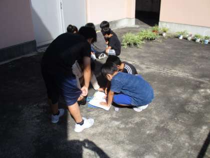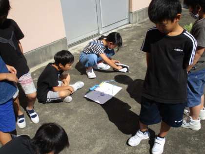 理科では、かげが一日の間にどのように動くか実験しました。1時間で大きく動くかげの様子に、子供たちは驚いていました。