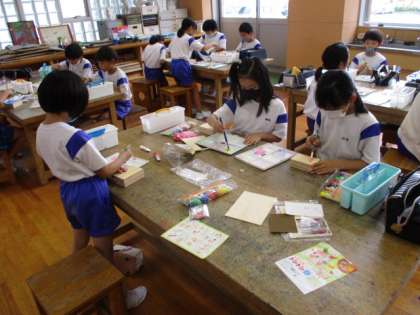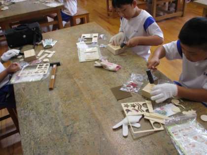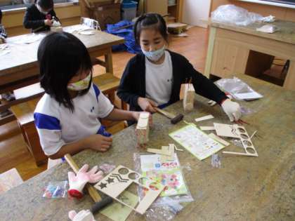 図工では、いろいろな角度から釘を打ったり、輪ゴムをかけたりするなど、楽しんで活動に取り組みました。