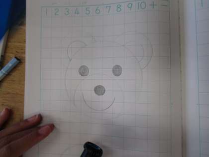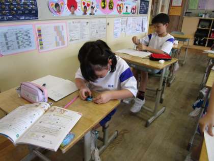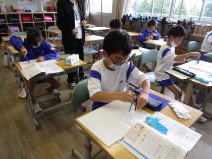 コンパスを初めて使い、半径の長さを変えたり、円の一部を書いたりする練習をしました。