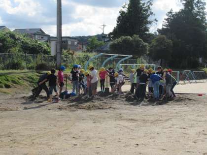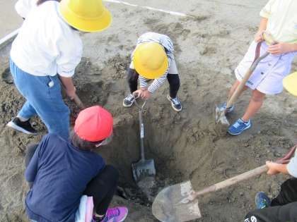 4年生 社会科「先人の努力を知ろう」 公開日 2020/10/15 更新日 2020/10/15 4年生 用水を開発した先人の努力を知ることで、今後の学習における発言や思考がさらに豊かになると考え、用水堀りの疑似体験をしました。 「2m掘る!」「みんなが入るような穴を掘る」と意気込んでいた子供たちですが、掘り進めることに硬くなる地盤や土砂、水の噴出により、思うように作業が進みません。 今回体験して分かったこと、感じたことを、これからの学習に役立てて欲しいと願います。