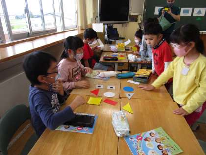 3年生 ほしいもの(形)を伝えよう! 公開日 2020/10/20 更新日 2020/10/20 3年生 「triangle!」「square!」「circle!」 形を英語で表現することを学びました。 ゲームで楽しみながら、理解を深めています。
