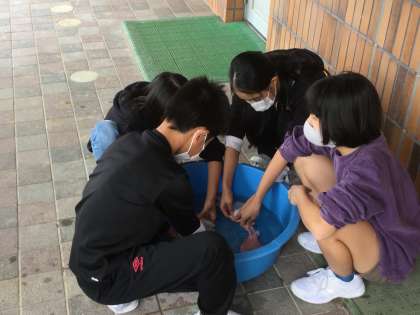 前回の学習では、汚れを着けた後すぐに洗いましたが、今日は体験学習で使った汚れてから1日経った軍手を洗いました。汚れの落ち具合は・・・?