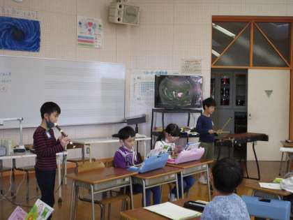 音楽では、グループで「ゆかいな木きん」を合奏しました。音と心を合わせて、美しい旋律を奏でました。