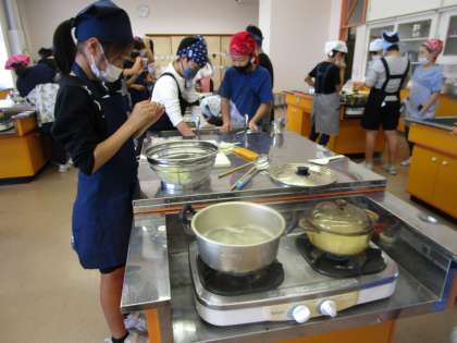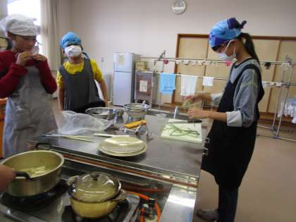 5年生 初めての調理実習1 公開日 2020/10/25 更新日 2020/10/25 5年生 家庭科の調理実習で、ごはんと味噌汁を作りました。お米を鍋に入れて炊きます。また、味噌汁にいれる野菜を洗いました。下ごしらいをしています。