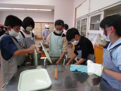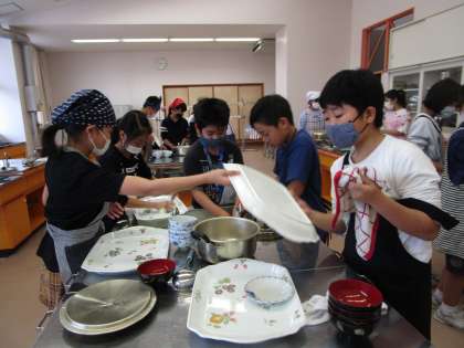 おなかがいっぱいになりました。次は、片付けです。鍋やお皿を洗ったり拭いたりしました。チームワークです。