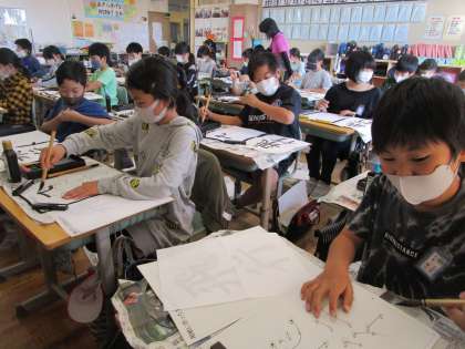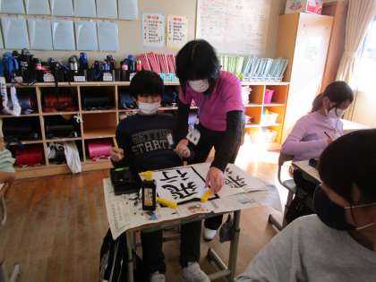 5年生 書写の時間 公開日 2020/11/05 更新日 2020/11/05 5年生 書写の時間です。心穏やかに、習字を書きました。 そこに、校内を回っておられた校長先生が来られ、習字の指導をしてくださいました。