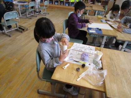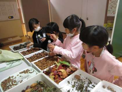 「あきとなかよし」になるために、どんぐりや松ぼっくり、落ち葉等を使っておもちゃを作っています。友達と相談しながら、上手くいく方法を考えていました。