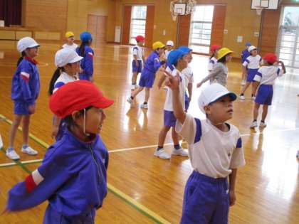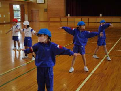 1年生 体育「表現遊び」 公開日 2020/11/09 更新日 2020/11/09 1年生 今日から、表現遊びに取り組んでいます。動物になりきったり、曲調に合わせたりして、思い切り身体を動かして踊りました。取り組んでいるうちにだんだん慣れ、鳥や蝶の羽ばたく様子を、指の先まで使って、丁寧に表現する子供もいました。