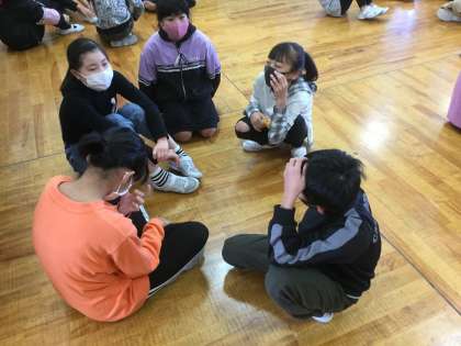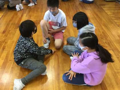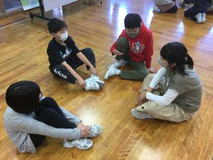 明日のファミリータイムについて、友達と話し合っています。目当てを達成するには、どんな内容にしたらよいかなど、下級生のことを考えながら班ごとに進めています。