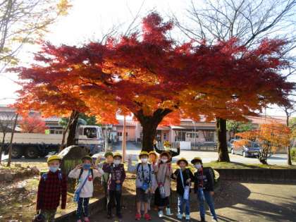 子供たちが下校しようと学校の玄関前に並んでいると、真っ赤な紅葉が日の光を受けて、きらきらと輝いていました。「きれいだね〜!」と話しながら、記念に写真を撮りました。最初に、生活科で秋見つけをした時には緑色の葉っぱでしたが、いつの間にかこんなに真っ赤になっていました。自然の移り変わりを感じながら、心豊かに育っている子供たちです。