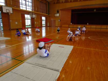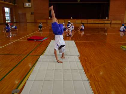 5年生 マット運動 公開日 2020/11/19 更新日 2020/11/19 5年生 体育でマット運動を行っています。 マット運動の発表会に向けて、前転、後転、側転を組み合わせた技を考えました。一生懸命、練習に取り組でいました。