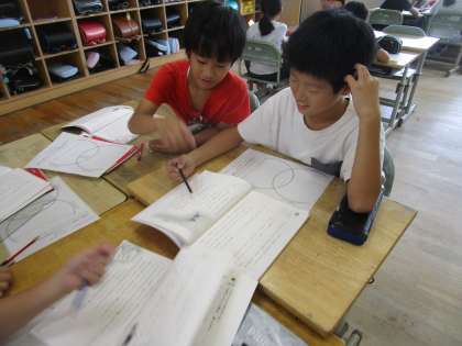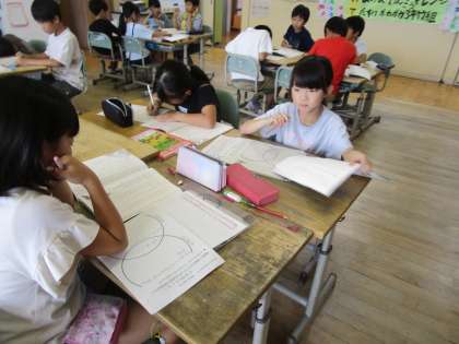 3年生 国語科 公開日 2024/10/02 更新日 2024/10/02 3年生 「ちいちゃんのかげおくり」の学習を進めています。1場面と4場面に登場した「かげおくり」の違いは何なのか、グループになって考えました。