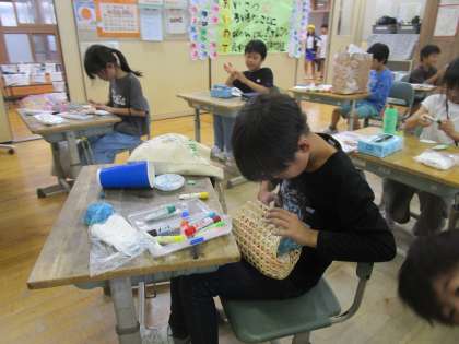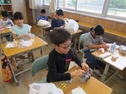 空き容器を生活の中で使える物に変身させるため、紙粘土や身辺材で飾り付けをしています。