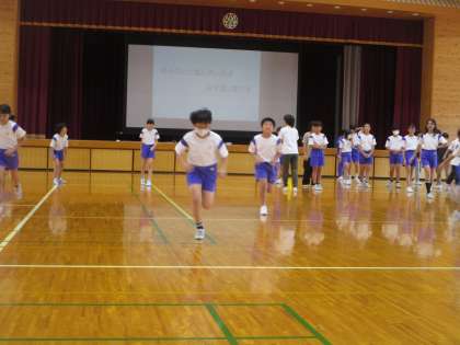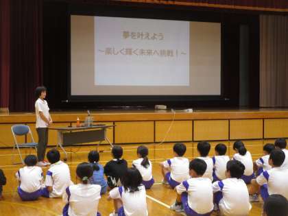 今日は「ドリームアスリート招聘事業」として、マラソンランナーの磯野あずさ先生が来校され、夢を叶えるために大切なことについて話を聞いたり、走り方のコツ等を教わったりしました。諦めないことの大切さや、どんなときも前を向いて頑張れば道は開けるという信念について教えていただきました。マラソン大会に向けて、意欲を高めた子供たちでした。