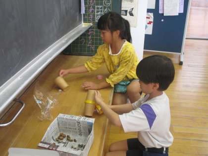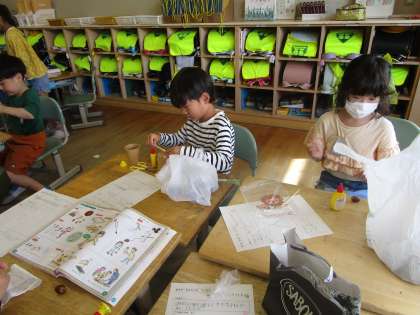 拾ってきたまつぼっくりやどんぐりを使って秋のおもちゃを作りました。「つまようじの長さを変えると回りやすくなった」「たのしい音のマラカスができた」などの様々な気付きがあったようです。