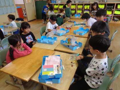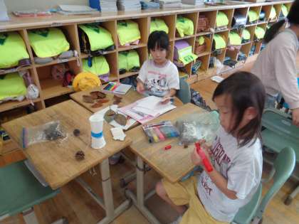 生活科の学習では、校外学習で拾ったどんぐりや松ぼっくり等を使って秋のおもちゃ作りをしています。