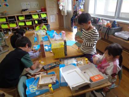 同じおもちゃを作っている友達とグループになって、遊び方やどんなおもちゃをつくるかを話し合っています。