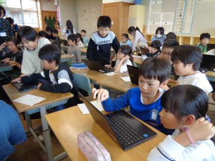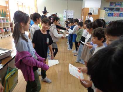 4年生 外国語活動 公開日 2024/10/25 更新日 2024/10/25 4年生 今日は、2年生さんを招待してハロウィンパーティーを開きました。招待状を持って2年生を迎えに行き、会場へ向かいました。アルファベットの歌を歌ったり、ゲームの仕方を教えてあげたり、お兄さん、お姉さんとしてがんばりました。