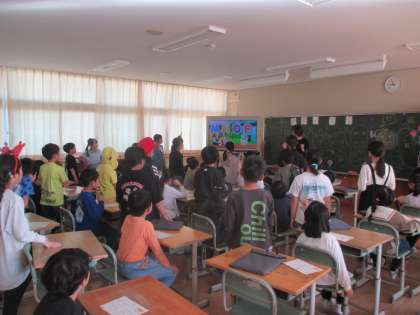 2年生 ハロウィーンパーティー 公開日 2024/10/26 更新日 2024/10/26 2年生 本日、4年生に招待されて河合先生、ALTのコーエン先生、2,4年生でハロウィーンパーティーを行いました。楽しく英語の歌を歌ったり、ゲームをしました。来年度以降に始まる外国語の学習も楽しみです。