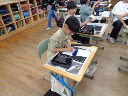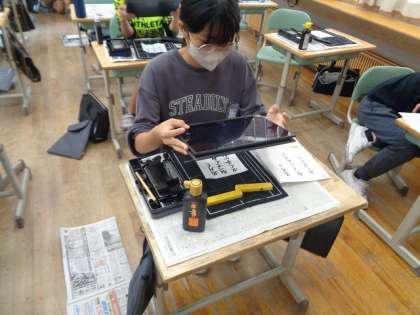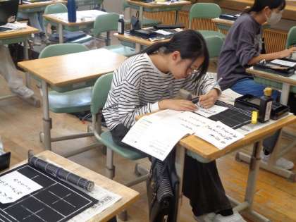 6年生 書写 文字の配列に気をつけて 公開日 2024/11/04 更新日 2024/11/04 6年生 用紙に合った文字の大きさとなるように文字の配列や行間に気をつけて書きました。完成した作品を写真で撮ってみんなで見合い、お互いの良さを見つけていました。