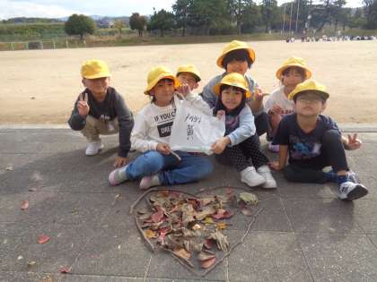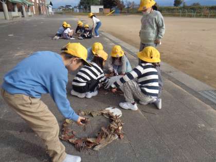 1年生 図画工作科〜つなげてつなげて〜 公開日 2024/11/12 更新日 2024/11/12 1年生 図画工作科の学習では、学校の周りにある自然物を拾って並べていろいろな形に見立てて今しました。 木の枝や枯れ葉を団の仲間と声をかけながら並べていました。