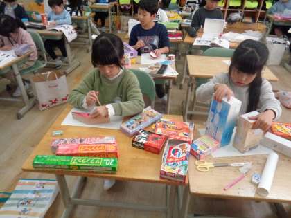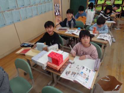 算数科の学習では、かたちあそびをしています。家にある空き箱などを使って形をとって絵を描きました。
