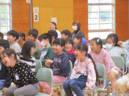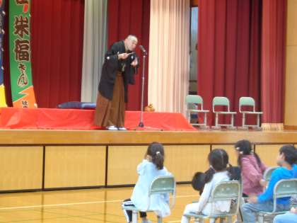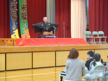 桂米福さんの落語を聞いたり、学年の代表者が落語の小噺に挑戦したりしました。