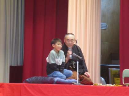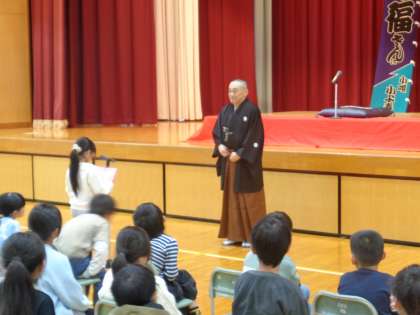 桂米福さんの落語を聞いたり、学年の代表者が落語の小噺に挑戦したりしました。