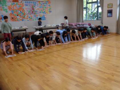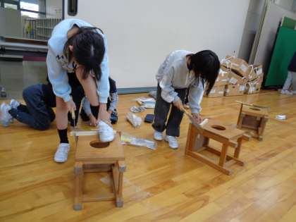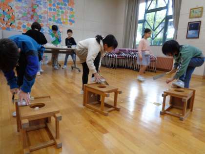 4年生 図工 公開日 2024/11/13 更新日 2024/11/13 4年生 前回よりもたくさんの人が、のこぎりを使って木を切ることができました。「最初は怖かったけれど、安全に気をつけて使うと楽しいな」と、自分のイメージに沿って思い思いに木を切る様子が見られました。 最後に、みんなで水拭きをして片付けもバッチリです。