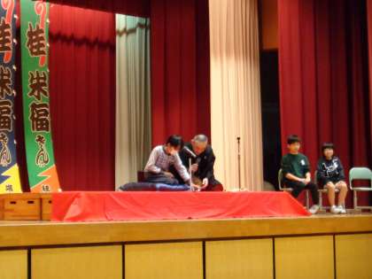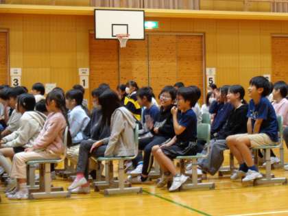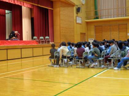 4年生 落語を聞く会 公開日 2024/11/13 更新日 2024/11/13 4年生 6時間目に桂米福さんの落語を聞く会がありました。表情や動作から場面の様子を想像して聞きました。みんなの笑い声が体育館に響き渡りました。 「しゃれ」をステージで挑戦した代表も、声と表情がとてもすてきで、みんなからも大好評でした。