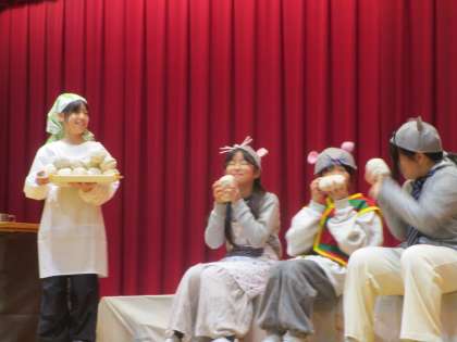 6年生 読書フェスティバル 公開日 2024/11/15 更新日 2024/11/17 6年生 杉の子劇団が「十五夜のお客さま」の劇を披露しました。毎朝、せりふの言い方や動きを練習し、見ている人みんなに楽しんでもらえるようにがんばってきました。本番前はとても緊張していたようでしたが、それを感じさせないのびのびとした演技ができました。また、劇の最後には小道具をつくったメンバーも紹介しました。発表後はどの子供も、「やってよかった」「楽しかった」と笑顔で話していました。