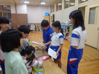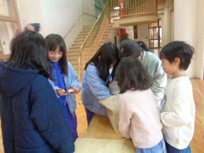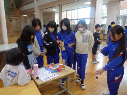 4年生 秋のおもちゃフェスティバルに招待されました! 公開日 2024/11/26 更新日 2024/11/26 4年生 先週、1年生さんからチラシをもらった子供たち。「今日、秋のおもちゃフェスティバルだよ!」と朝から楽しみな様子でした。どんぐりで作ったけん玉ややじろべえ、迷路など1年生さんの説明を聞きながら楽しく遊びました。