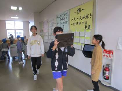 放送委員会 学校かくれんぼ 公開日 2024/11/27 更新日 2024/11/27 委員会活動 放送委員会が、学校かくれんぼを企画しました。5人の先生が校内の様々な場所に隠れ、子供たちがファミリー班で協力をして探しました。活動の様子は、放送委員会がmeetやチャットで連絡をとりながら実況中継をしました。子供たちは、「まさかここに隠れているとは思わなかった」「見付けられなくても楽しかった」「小さい子たちが走ってしまわないように、手をつないで歩いた」と振り返っていました。